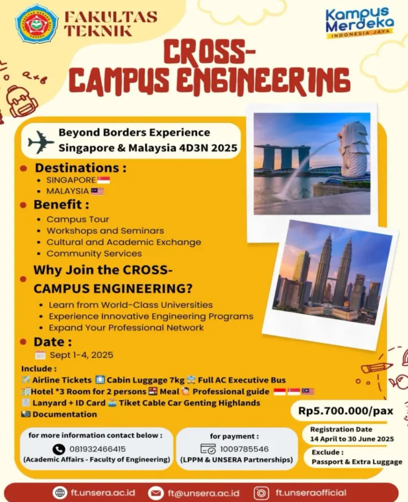 Serang, unsera.ac.id – Fakultas Teknik Universitas Serang Raya (UNSERA) kembali membuka kesempatan emas bagi para mahasiswanya melalui program internasional bertajuk Cross-Campus Engineering 2025. Program ini akan diselenggarakan selama 4 hari 3 malam pada 1–4 September 2025, dengan destinasi utama Singapura dan Malaysia.