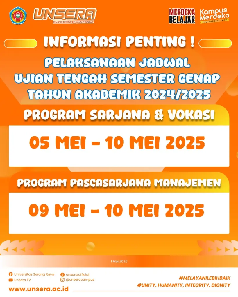 Serang, 4 Mei 2025 — Universitas Serang Raya (UNSERA) secara resmi mengumumkan jadwal pelaksanaan Ujian Tengah Semester (UTS) Genap Tahun Akademik 2024/2025. Informasi ini ditujukan kepada seluruh civitas akademika, baik dari Program Sarjana, Vokasi, maupun Pascasarjana Manajemen.