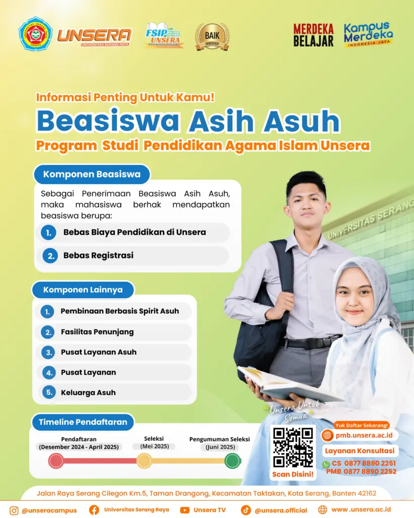 pmb.unsera.ac.id Fakultas Ilmu Sosial dan Ilmu Politik (FSIP) Universitas Serang Raya kembali menghadirkan Beasiswa Asih Asuh untuk Program Studi Pendidikan Agama Islam (PAI). Program ini ditujukan untuk memberikan akses pendidikan tinggi yang inklusif dan berkeadilan, sejalan dengan semangat Kampus Merdeka dan Merdeka Belajar.