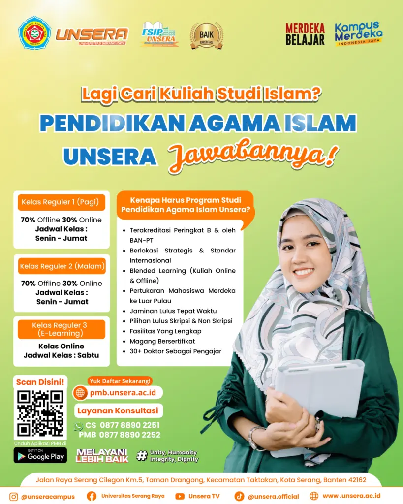 Serang, unsera.ac.id β Bagi Anda yang tengah mencari kampus dengan program studi Pendidikan Agama Islam berkualitas dan fleksibel, Universitas Serang Raya (UNSERA) adalah jawabannya! Dengan sistem pembelajaran yang modern dan terakreditasi BAN-PT, UNSERA siap mencetak lulusan unggul di bidang keislaman yang relevan dengan kebutuhan zaman.