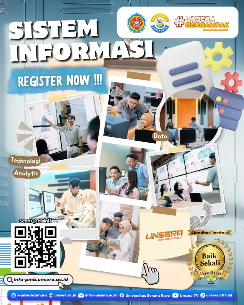Di era digital saat ini, dunia industri membutuhkan talenta yang mampu menghubungkan teknologi dengan kebutuhan bisnis. Jurusan Sistem Informasi Universitas Serang Raya (UNSERA) hadir sebagai pilihan cerdas bagi kamu yang ingin membangun karier digital melalui pembelajaran teknologi, analisis sistem, dan pemahaman proses bisnis. Dengan kurikulum yang relevan dan lingkungan perkuliahan yang aktif, UNSERA membekali mahasiswa agar siap menghadapi tantangan dunia kerja modern. Register sekarang di link ini pmb.unsera.ac.id.