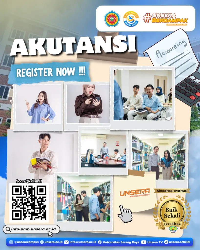 Dengan kurikulum yang relevan dan berorientasi pada kebutuhan dunia kerja, Jurusan Akuntansi UNSERA menjadi pilihan strategis bagi calon mahasiswa yang ingin berada di pusat pengelolaan dan pengambilan keputusan keuangan.
