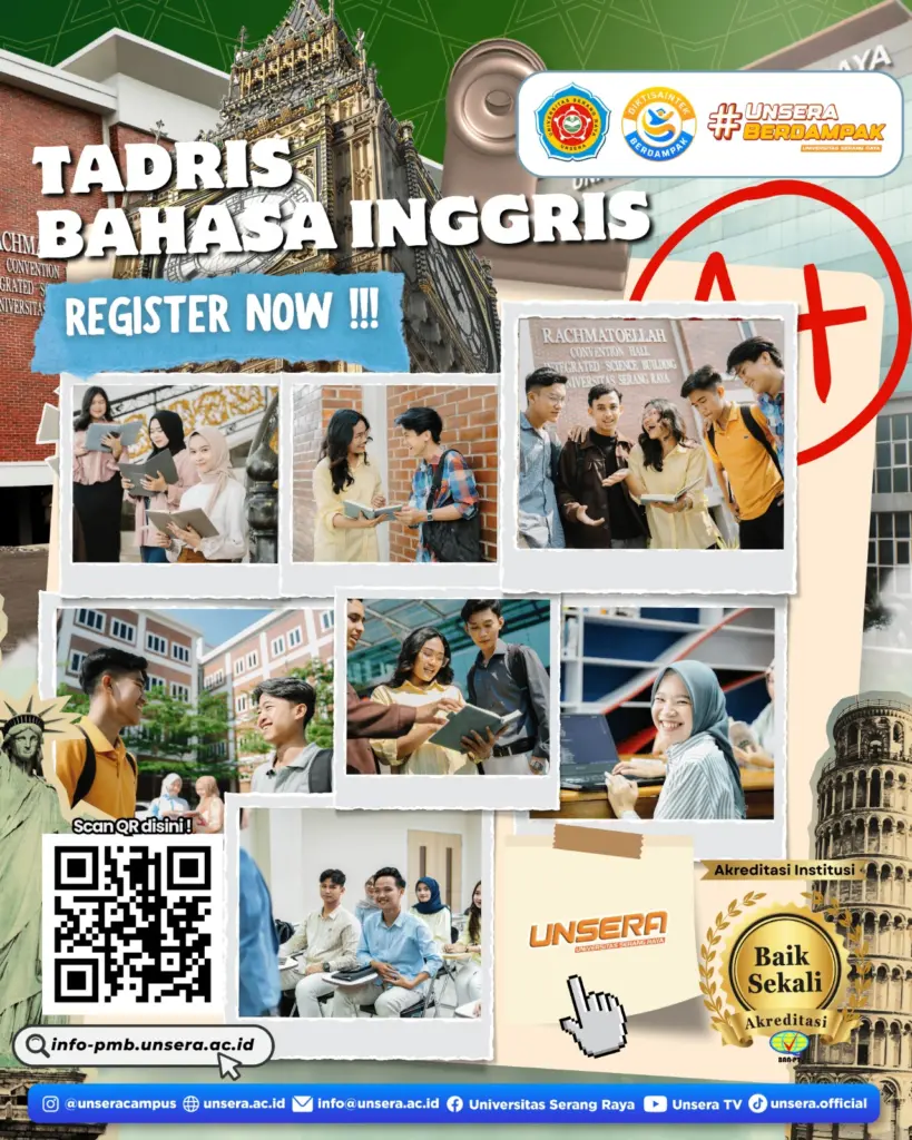 info-pmb.unsera — Program Studi Tadris Bahasa Inggris Universitas Serang Raya (UNSERA) dirancang untuk mencetak lulusan yang unggul dalam penguasaan bahasa Inggris serta kompeten dalam dunia pendidikan. Mahasiswa dibekali kemampuan komunikasi aktif, metode pembelajaran inovatif, serta pemanfaatan teknologi pendidikan.