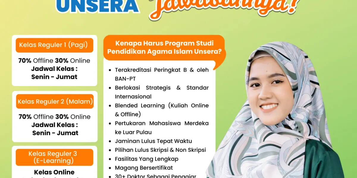 Serang, unsera.ac.id – Bagi Anda yang tengah mencari kampus dengan program studi Pendidikan Agama Islam berkualitas dan fleksibel, Universitas Serang Raya (UNSERA) adalah jawabannya! Dengan sistem pembelajaran yang modern dan terakreditasi BAN-PT, UNSERA siap mencetak lulusan unggul di bidang keislaman yang relevan dengan kebutuhan zaman. Program Studi Pendidikan Agama Islam UNSERA menawarkan tiga pilihan kelas yang fleksibel:📘 Reguler 1 (Pagi) – 70% Offline, 30% Online (Senin–Jumat)📘 Reguler 2 (Malam) – 70% Offline, 30% Online (Senin–Jumat)📘 Reguler 3 (E-Learning) – 100% Online (Kelas Sabtu) Kenapa Harus Kuliah di Pendidikan Agama Islam UNSERA? ✅ Terakreditasi B oleh BAN-PT✅ Lokasi strategis dengan standar internasional✅ Sistem Blended Learning (Online & Offline)✅ Program Pertukaran Mahasiswa ke luar pulau✅ Jaminan lulus tepat waktu✅ Opsi tugas akhir: Skripsi atau Non Skripsi✅ Fasilitas lengkap & modern✅ Magang bersertifikat✅ Dosen berkualitas dengan lebih dari 30 Doktor Tak hanya menawarkan pendidikan, UNSERA hadir membawa nilai Unity, Humanity, Integrity, dan Dignity dalam setiap proses belajar mengajar. 🎓 Segera daftar melalui: pmb.unsera.ac.id📱 Konsultasi via WhatsApp:CS: 0877 8890 2251PMB: 0877 8890 2252 📍 Alamat Kampus:Jalan Raya Serang Cilegon Km. 5, Taman Drangong, Kecamatan Taktakan, Kota Serang, Banten 42162 Untuk informasi lebih lanjut, silakan kunjungi:🌐 Website resmi: www.unsera.ac.id✉ Email: info@unsera.ac.id📷 Instagram: @unseracampus📺 YouTube: Unsera TV🐦 Twitter: @unseracampus
